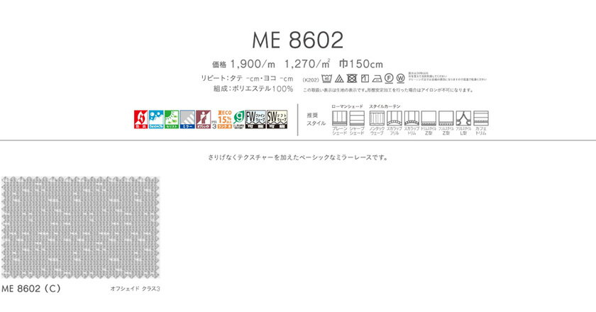 ME8602 ME2584 防炎 ウォッシャブル セリスト加工 抗ウイルス性 消臭 VOC軽減 ミラーレース オフシェイドクラス3 夏エコB グリーン購入 FW可能 SW可能 プレーンシェード シャープシェード ノンタックウェーブ スカラップフリル スカラップトリム ハイギャザートリム ハイギャザーフリル センタークロスフリル カフェトリム K202一覧はここをクリック↓