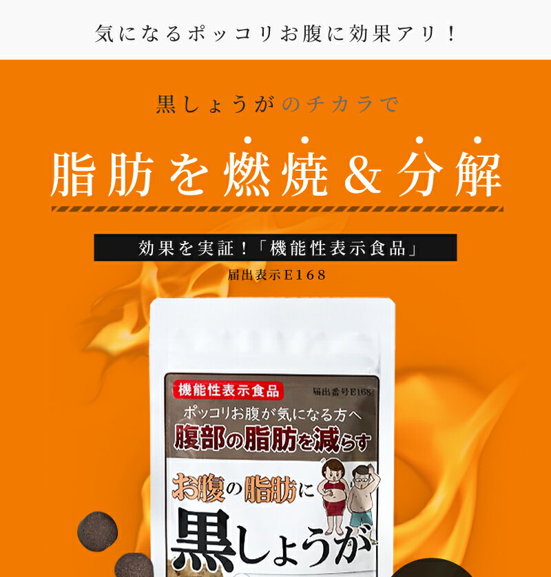 [機能性表示食品 届出番号E168]腹部の脂肪を減らすお腹の脂肪に黒しょうが 商品名 [機能性表示食品 届出番号E168]お腹の脂肪に黒しょうが 名称 ブラックジンジャー抽出物加工食品 届出表示 本品にはブラックジンジャー由来ポリメトキシフラボンが含まれ ます。
