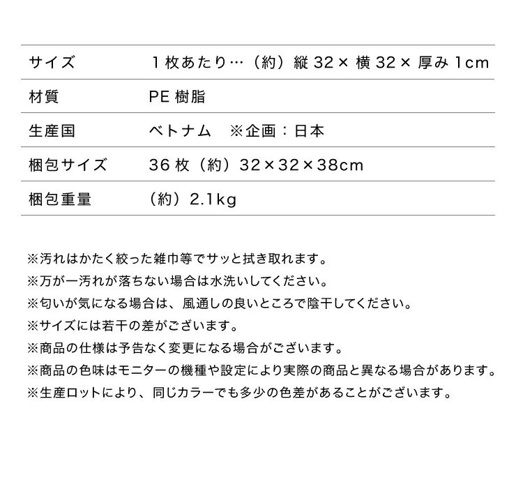 【商品名】ナチュラルテイストの木目調!安心素材EVAジョイントマット[ハウスカ]【商品サイズ】1枚あたり…(約)縦30×横30×厚み1cm【セット内容】ジョイントマット●36枚組 【素材】PE樹脂【生産国】ベトナム ※企画:日本【梱包サイズ/梱包重量】36枚(約)32x32x38cm/(約)2.1kg※汚れはかたく絞った雑巾等でサッと拭き取れます。
