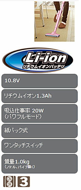 ■吸込仕事率(W) パワフル:20 強:14 標準:5 ■1充電あたりの連続使用時間(min)[分] パワフル:約8 強:約12 標準:約23 ■集じん容量(ml) 500(ダストバッグ) 330(紙パック) ■電源 バッテリ内臓(1.3Ah-直流10.8V) ■機体寸法(mm)(長さ×幅×高さ) 446×113×136(ノズル取付時の長さ983mm) ■質量(kg) 1.0(ノズル・パイプなし・本機のみ) ■標準付属品 フロアじゅうたんノズル・サッシ(すきま)用ノズル・ストレートパイプ・紙パック(10枚)・ダストバック ★